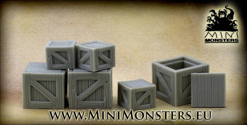 Mini Monsters Big Crates - 6pc - MM-39. This kit includes 6 wooden crates. The set contains three large boxes with loose lid and three small boxes (fixed cover) that are back in the big boxes.
