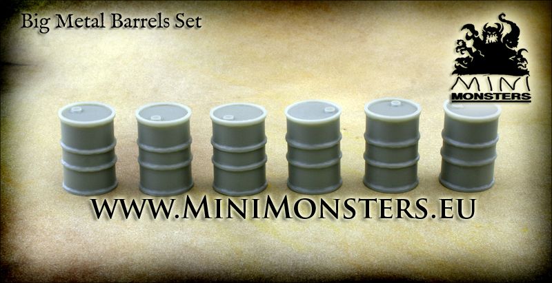 Mini Monsters Big Metal Barrels - 6pcs - MM-12. This kit contains 6 large metal barrels. The model are supplied unpainted.