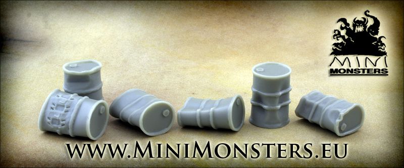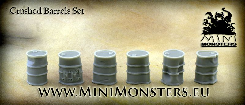 Mini Monsters Crushed Barrels - 6pcs - MM-13. This kit contains 6 crushed and dented metal barrels. The models are supplied unpainted.