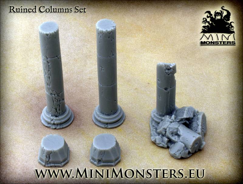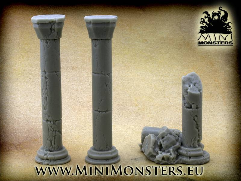 Mini Monsters Ruined Columns - 3 pieces - MM-29. This kit contains 2 complete smooth columns and a half ruined column.