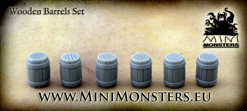 Mini Monsters Wooden Barrels - 6pc - MM-36. This kit includes six wooden barrels or drums. The cover is not loose.