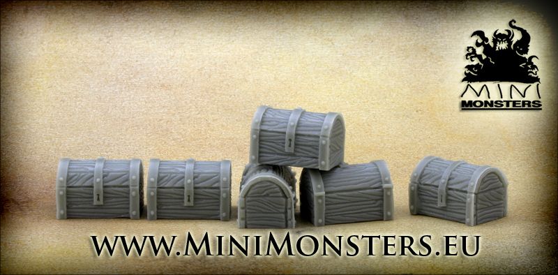 Mini Monsters WWooden Chests - 6pc - MM-38. This kit includes 6 wooden crates. It may be normal chests, but much more adventurous, of course if you imagine the treasure chests are full of gold and silver for greedy hands. The cover is not loose.