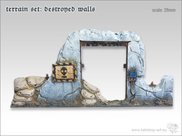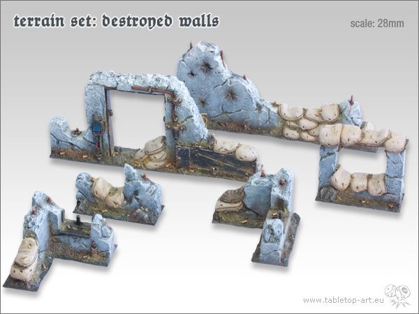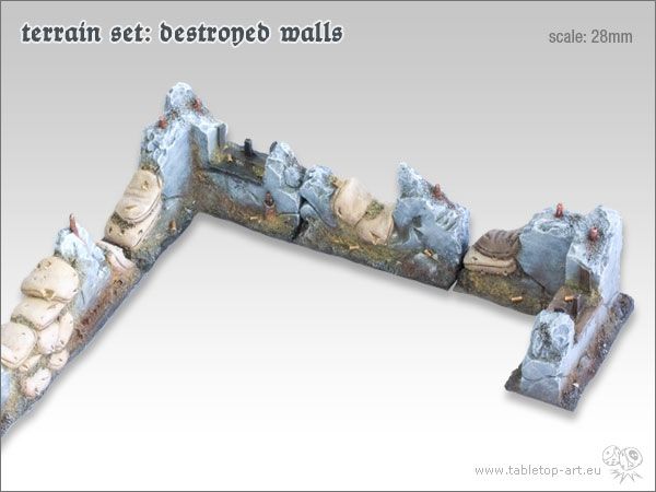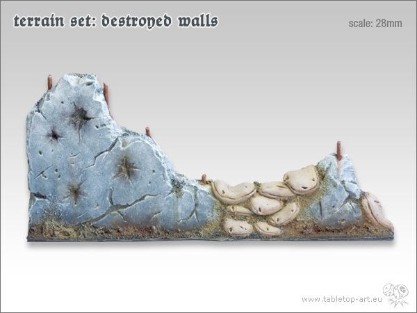 Tabletop-Art Terrain Set - Destroyed Walls (TTA601031)Â The ruined walls are littered with bullet shells and debris, they were additionally secured with sandbags. The 6 sections are made from high-quality resin and are created for 28mm wargames.