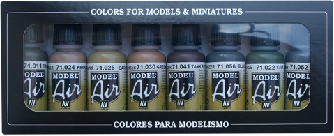 Vallejo Model Air Panzer Colors set (71177) is a set of 8 colors Model Air for airbrushing and painting models and miniatures. The set has a selection of special Panzer airbrush camouflage colors for vehicles, figures and other models. The set includes 8 eyedropper bottles of 17 ml. paint.