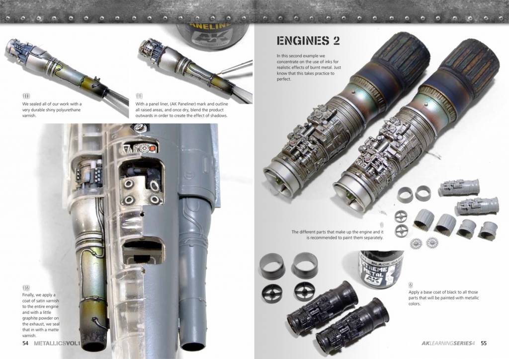 AK interactive Metallics Vol 1 - AK Learning Series nr 4. In dit eerste deel zullen we laten zien hoe je metallic lakken te begrijpen en hoe ze correct toe te passen met de juiste producten. Ook bespreken we technieken en tips delen die van pas komen als je vast zit. We zullen voorbeelden toegepast op vliegtuigen, motoren, auto's, AFV's en informatie over allerlei modellen te zien.