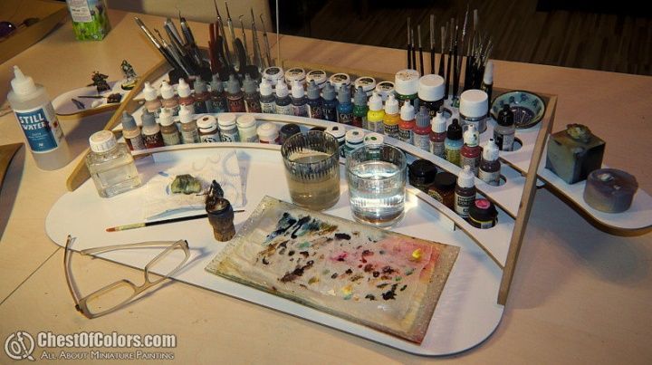 Hobbyzone Professional Paint Station. Dit gelamineerde MDF professional paint station is 60 cm x 40 cm x 8 cm en heeft drie rijen beschikbaar om verf (zowel Citadel als Vallejo potjes) kwijt te kunnen en een flink aantal gaten om onder andere penselen, vijlen, mesjes en twee water potjes kwijt te kunnen. Het grote werkblad geeft genoeg ruimte om je miniaturen te schilderen. Doordat de platen van een kunststof laagje zijn voorzien is vuil eenvoudig weg te vegen.