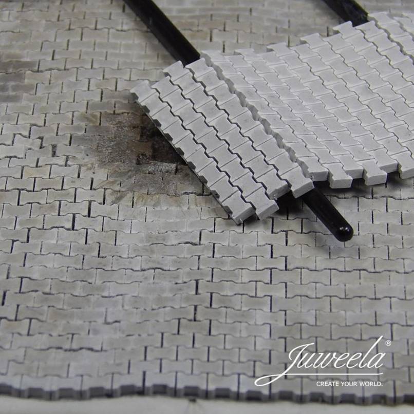 Flexyway geeft modelbouwers een volledig nieuwe manier van diorama bouw. Straten leggen was nooit zo eenvoudig. Deze grijze begin- en halve Flexyway H-stenen sluiten perfect aan op de flexibele matjes met stenen van artikelnummer 23321.