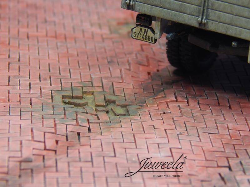 Flexyway geeft modelbouwers een volledig nieuwe manier van diorama bouw. Straten leggen was nooit zo eenvoudig. Deze rode Flexyway visgraat motief stenen kunnen perfect gebruikt worden om een mooie straat te leggen.Â