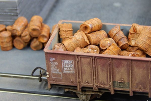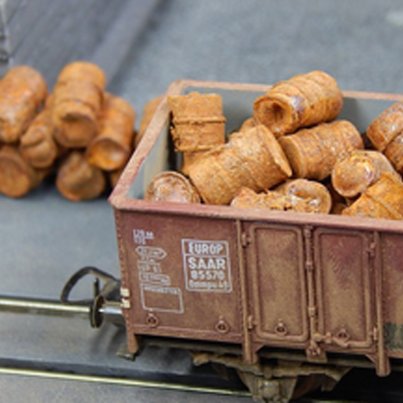 Juweela Oude Roestige Vaten - 20st - 24131. Oude gebruikte gedeukte drums voor model- en dioramabouw gemaakt van Keramiek en voorzien van een roestige afwerking: echt metaalschroot. Schaal 1:45/1:48.