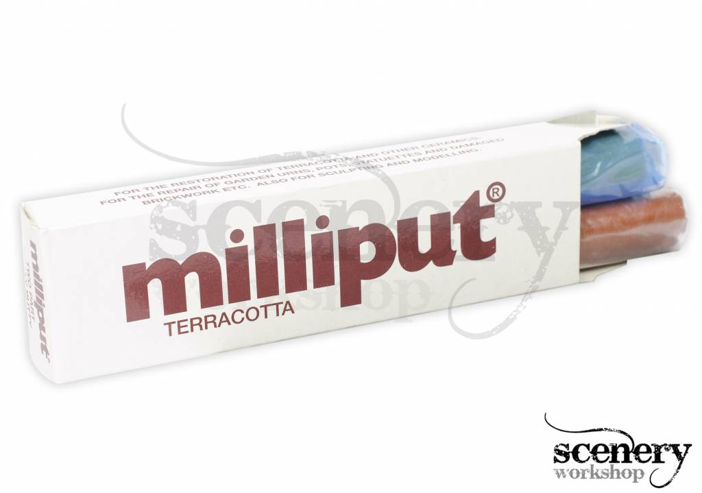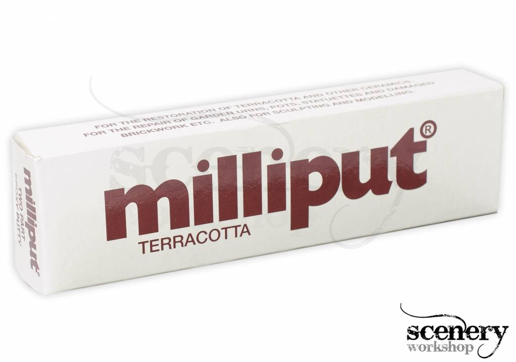 Milliput Terracotta is een van de bekendste epoxy putty producten om te modelleren, maar dan in een praktische terracotta kleur. Het materiaal werkt zoals het bekende GreenStuff. Milliput bestaat ook uit twee componenten (2x 56,7 gr.) en door deze goed te vermengen (5 min. goed kneden) zal het materiaal langzaam gaan uitharden, waarna het na 3 uur volledig uitgehard is. Door de putty koel, droog en luchtdicht te bewaren blijft het ongeveer 2 jaar bruikbaar.