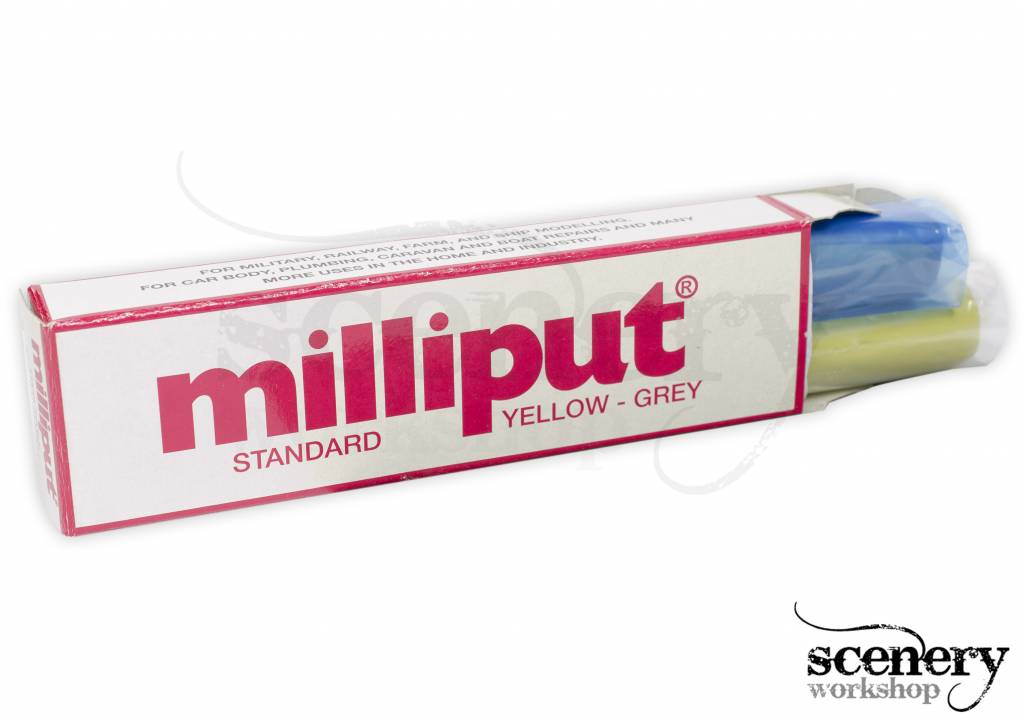 Milliput Yellow-Grey is een van de bekendste epoxy putty producten om te modelleren, dit is het originele meest veelzijdige product en een voorloper van de andere Milliput producten. Het materiaal werkt zoals het bekende GreenStuff. Milliput bestaat ook uit twee componenten (2x 56,7 gr.) en door deze goed te vermengen (5 min. goed kneden) zal het materiaal langzaam gaan uitharden, waarna het na 3 uur volledig uitgehard is. Door de putty koel, droog en luchtdicht te bewaren blijft het ongeveer 2 jaar bruikbaar.