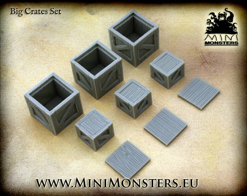 Mini Monsters Big Crates - 6st - MM-39. Deze kit bevat 6 houten kisten. In de set zitten 3 grote kisten met losse deksel en 3 kleine kisten (met vaste deksel) die weer in de grote kisten passen.