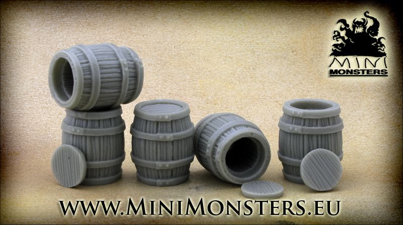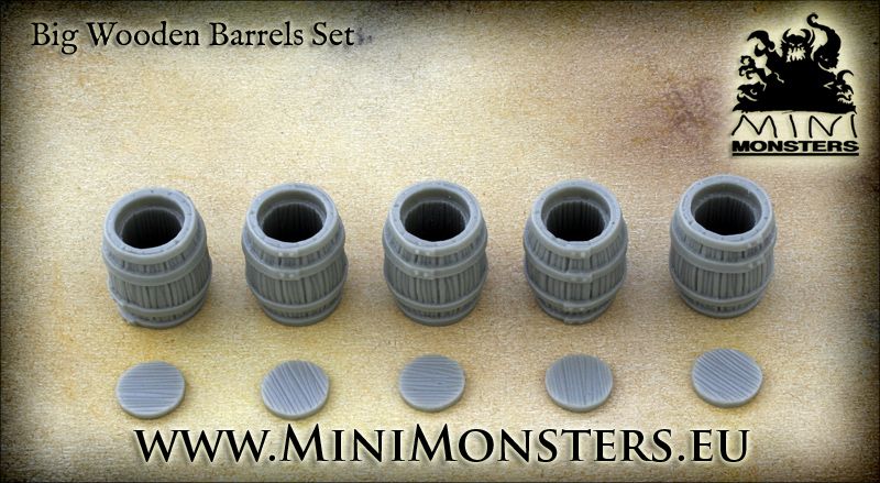 Mini Monsters Big Wooden Barrels - 5st - MM-37. Deze kit bevat 5 grote houten tonnen of vaten met 5 losse deksels.