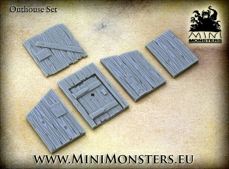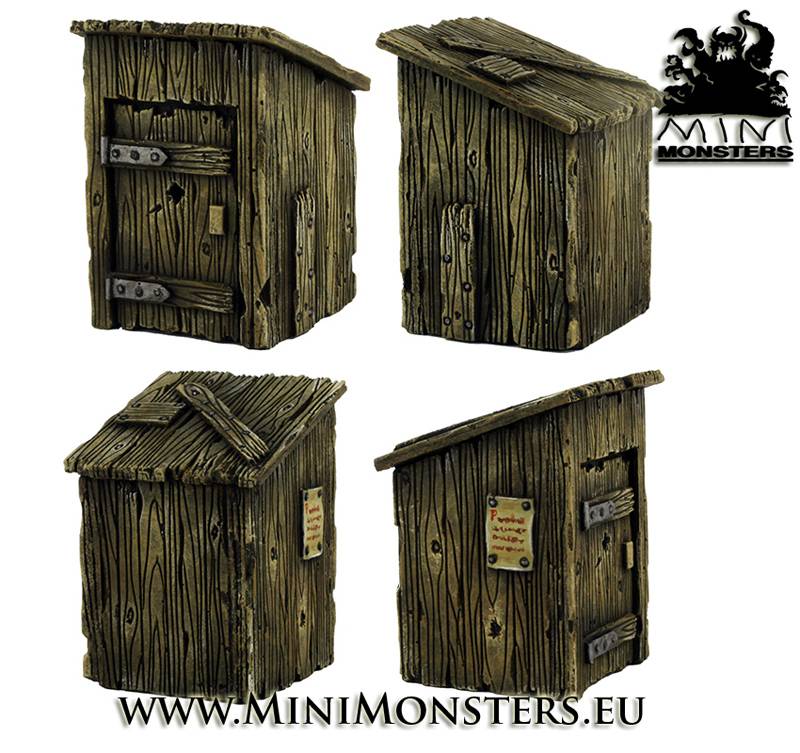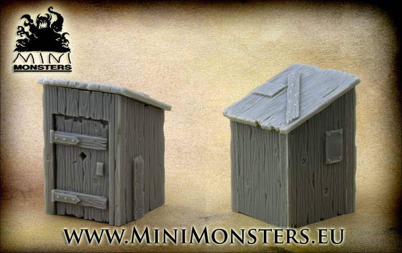 Mini Monsters Outhouse - MM-06. Elke warrior of boer moet een bijgebouw. Dus waarom niet een mooie houten bijgebouw te zetten naast uw cottage of molen. Deze kit bestaat uit 5 delen. Het model wordt ongeverfd geleverd en moet nog in elkaar gezet worden. Gebruikt hiervoor plastic lijm.
