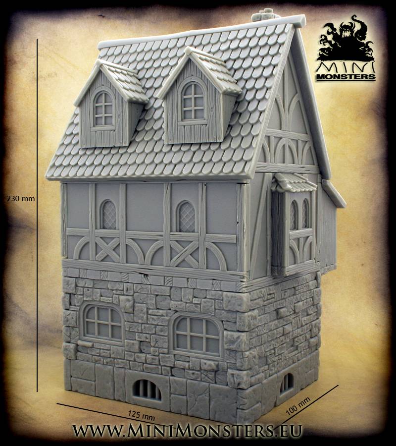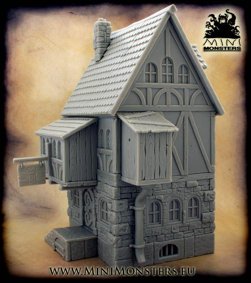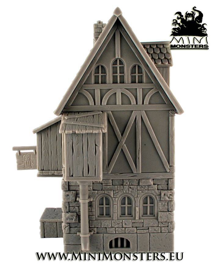 Mini Monsters Medieval Tavern - MM-01. Menig dwerg en zwerver heeft dagen en nachten verloren in deze middeleeuwse herberg. Het bord buiten de taverne lokt hen naar binnen en houdt ze binnen tot de eerste stralen van de zon in de ochtend. Dit enorm gedetailleerde gebouw zal alle aandacht te krijgen op een speltafel of in een diorama.