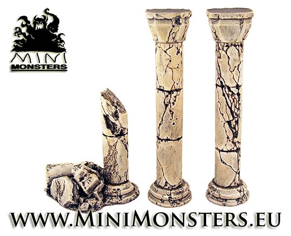Mini Monsters Ruined Columns - 3st - MM-29. Deze kit bevat 2 volledige gladde zuilen en een half verwoeste zuil.Â