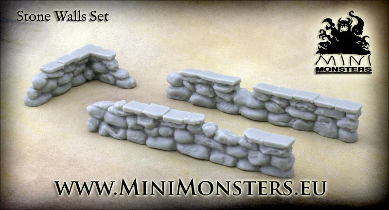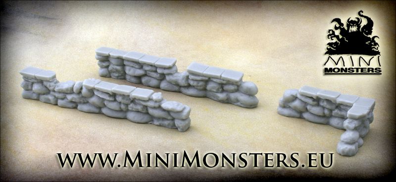 Mini Monsters Stone Walls set 1 - 3st - MM-30. Deze kit bevat 2 rechte muren en 1 muurtje in een hoek.