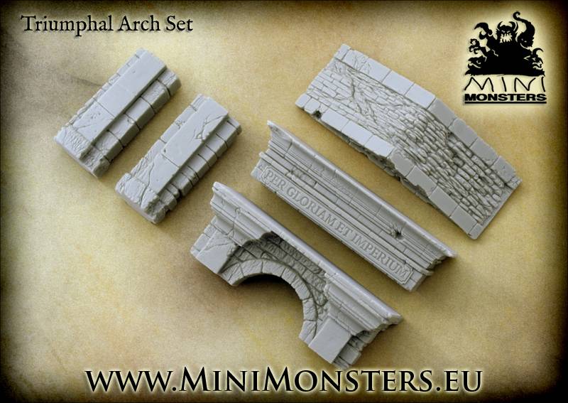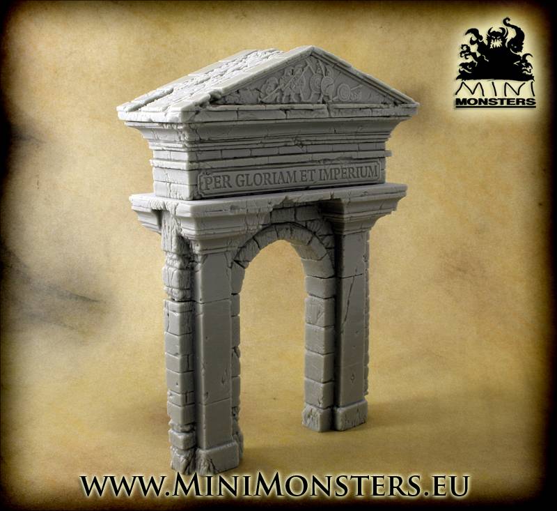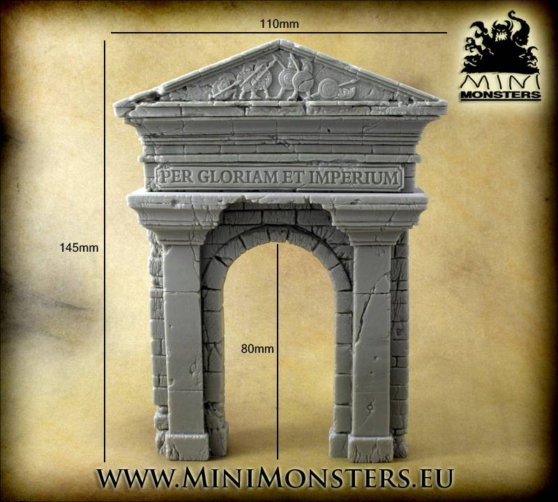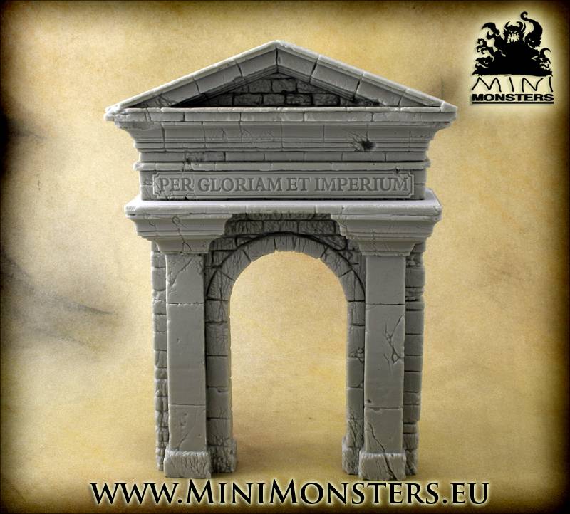 Mini Monsters Triumphal Arch - MM-20. Deze triomfboog is gemaakt om de glorie van het rijk te laten zien. Mooi gedetaillerd en vol resin gegoten zal deze niet misstaan op een speelveld. De ruimte tussen de boog is 40 mm en het rechte deel onder de boog is 60mm hoog. De tekst is: Per Gloriam et Imperium = Voor de glorie en het rijk.