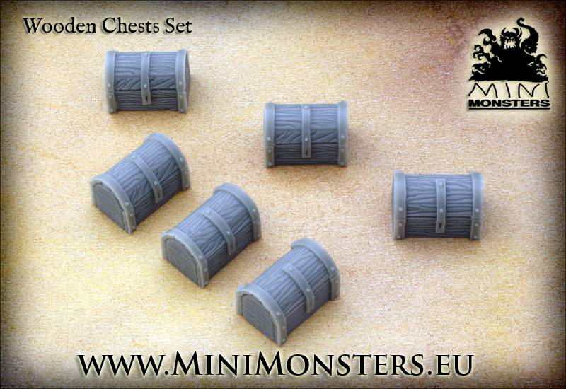 Mini Monsters WWooden Chests - 6st - MM-38. Deze kit bevat 6 houten kisten. Het kunnen gewone dekenkisten zijn, maar veel avontuurlijker is het natuurlijk als je je voorstelt dat het schatkisten zijn vol met goud en zilver voor grijpgrage handjes. De deksel is niet los.