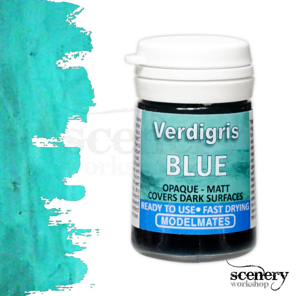 Modelmates Verdigris Blue is hét perfecte verdigris of koperoxide middel in een 18 ml. potje. Snel en eenvoudig aan te brengen met een kwast direct uit het potje. Als het droogt ontstaat er een realistisch blauw verdigris effect. Gebruik het vooral op kleine stukken zoals paneellijnen, scharnieren en andere diepergelegen delen. Ook geschikt voor airbrush.