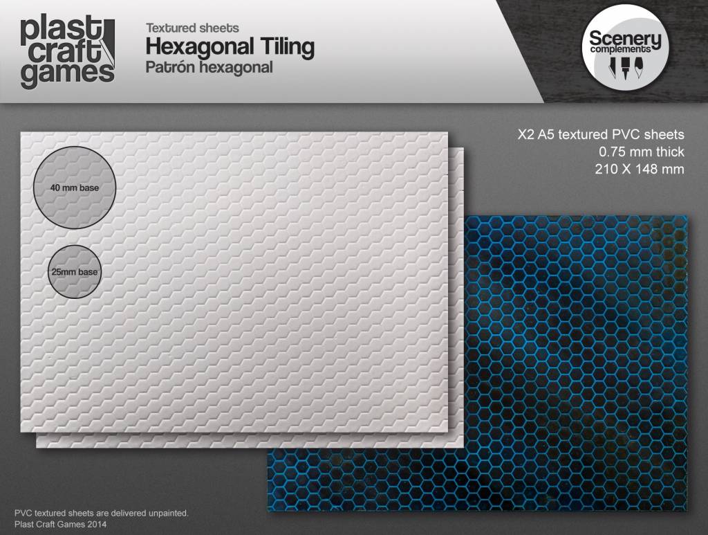 Dit is textured plasticard met Hexagonale structuur. Dit product kan worden gebruikt als een aanvulling voor miniatuur scenery, diorama's, gameboard oppervlakken of het aanpassen van miniatuur bases. Het plasticard met textuur is eenvoudig te snijden met een scherp mes of te knippen met een schaar. Gebruik voor het verlijmen plasticlijm en kunnen nadat ze voorzien zijn van een primer met acrylverf beschilderd worden.