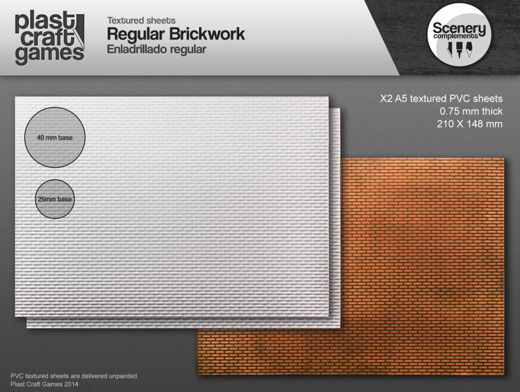 Dit is textured plasticard met Metselwerk structuur. Dit product kan worden gebruikt als een aanvulling voor miniatuur scenery, diorama's, gameboard oppervlakken of het aanpassen van miniatuur bases. Het plasticard met textuur is eenvoudig te snijden met een scherp mes of te knippen met een schaar. Gebruik voor het verlijmen plasticlijm en kunnen nadat ze voorzien zijn van een primer met acrylverf beschilderd worden.