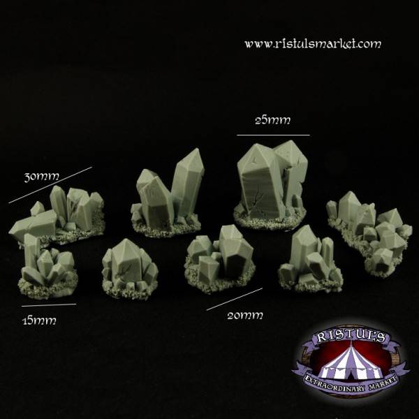 Ristuls Extraordinary Market Crystals Basing Kit BSKT0023. Heb je een planeet met buitenaardse wezens dat wat saai is? Heb je een nieuwe energie bron nodig? Of heeft je mijn wat extra schittering nodig? Dan zijn deze kristallen perfect. Deze set bestaat uit 8 verschillende kristallen. De hoogte van de kristallen varieren van 13mm to 30mm. Gemaakt van hoogwaardige resin.