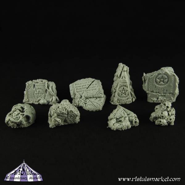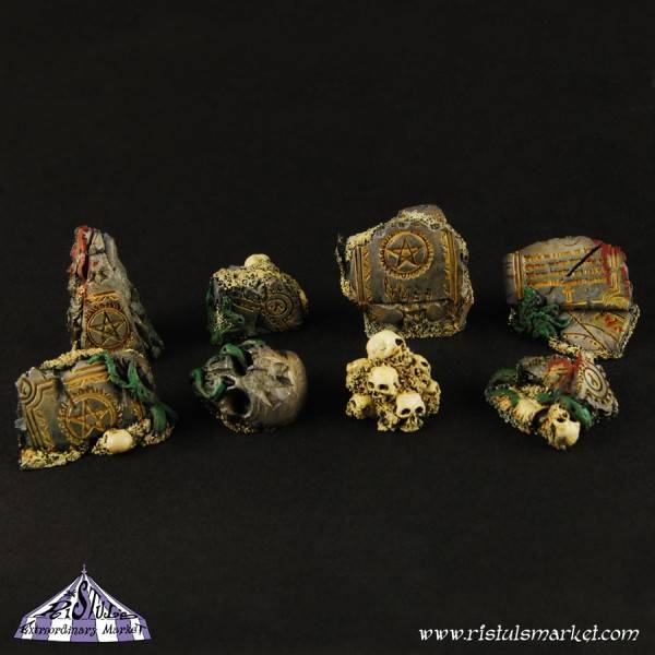 Set bestaat uit 10 willekeurig gekozen stukken in Dark Temple Ruins thema, zoals Stenen met runen, pentagrammen, schedels en teksten. Fantastisch als aanvulling op een base of diorama. Gemaakt van hoogwaardige resin.
