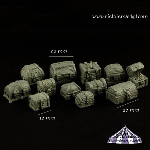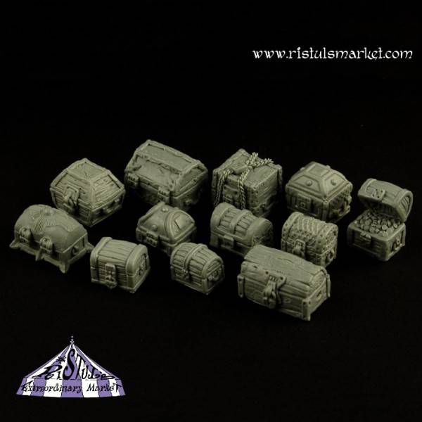 Set bevat 12 schatkisten in verschillende soorten en maten. De set bevat 1 open schatkist.