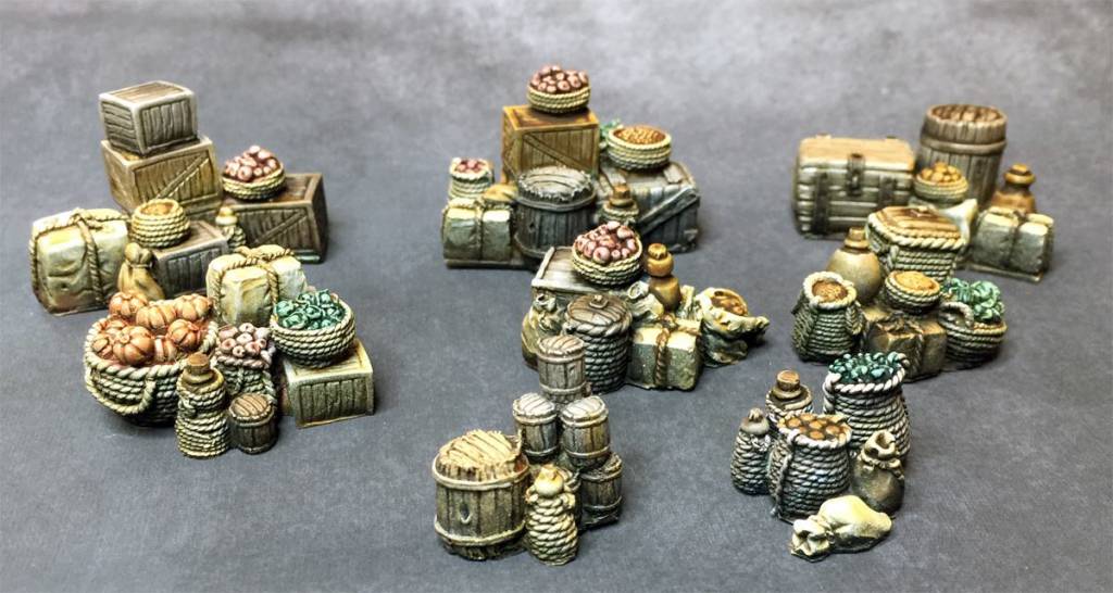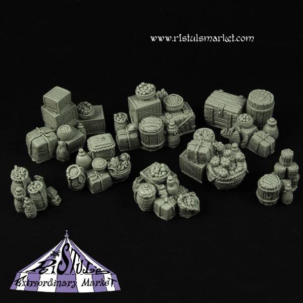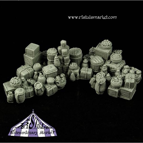 Set bevat 8 stapels met goederen zoals eten, dranken, kratten, pakketten, emmers en tonnen.