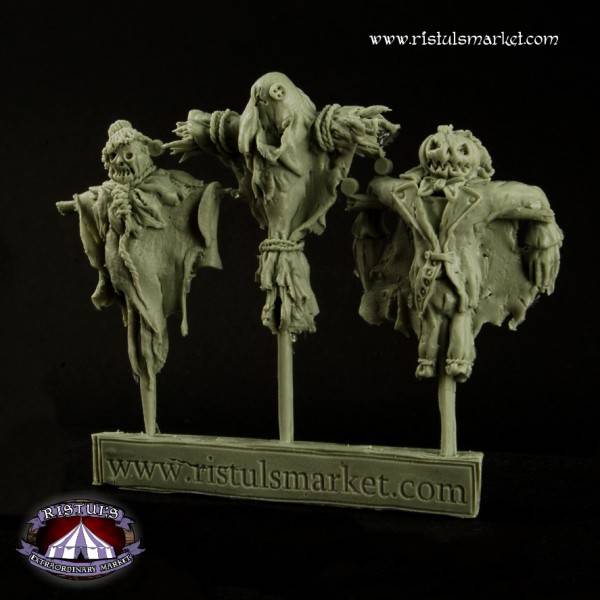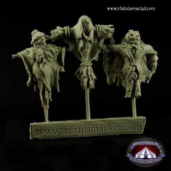 Ristuls Extraordinary Market Scarecrows BSKT0024. Iedere boer heeft last van vogels op zijn land en hoe zijn ze beter te verjagen dan met een vogelverschrikker. Natuurlijk misstaan ze ook niet op een halloween feestje of midden in een dorp om dorpelingen bang te maken. Deze set bevat 3 verschillende met een gemiddelde hoogte van 40mm. Gemaakt van hoogwaardige resin.