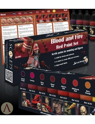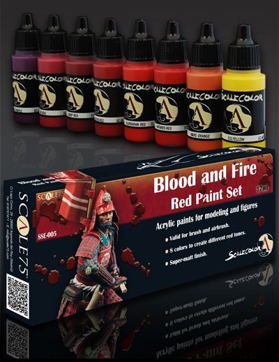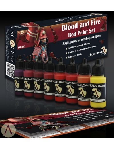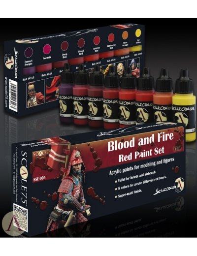 Scale 75 Blood and Fire - Red Paint Set bevat 8 potjes Scalecolor acrylverf van 17ml. Deze verf kan zowel met het penseel als met de airbrush verwerkt worden en heeft een goede dekkracht en vloeit prettig.