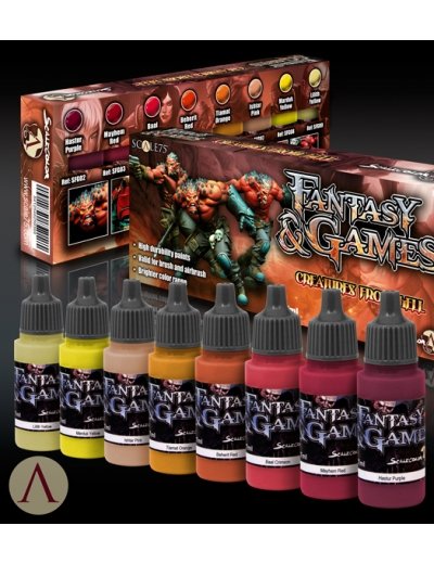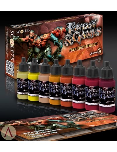 Scale75 Fantasy and Games -Â Creatures from Hell bevat 8 potjes voornamelijk rood en geeltinten Scalecolor Fantasy & Games acrylverf van 17ml. Deze verf kan zowel met het penseel als met de airbrush verwerkt worden en heeft een goede dekkracht en vloeit prettig.