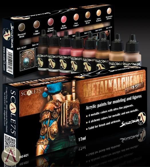 Scale 75 Metal'n Alchemy - Copper series metallic paint set bevat 8 potjes Scalecolor acrylverf van 17ml. Deze verf kan zowel met het penseel als met de airbrush verwerkt worden en heeft een goede dekkracht en vloeit prettig.