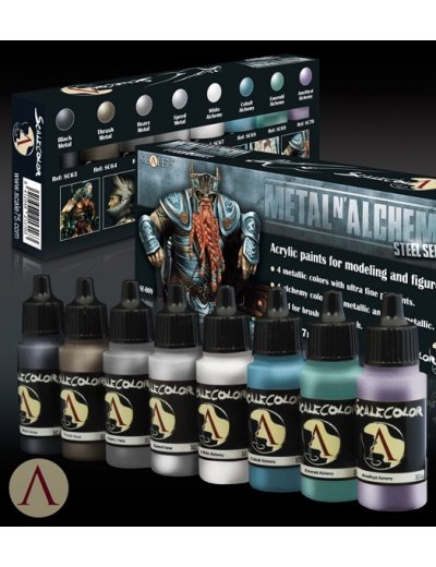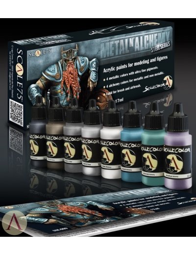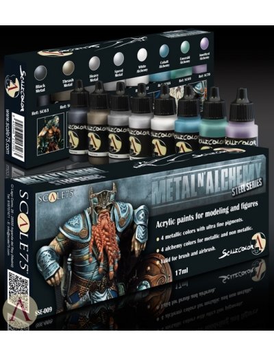 Scale 75 Metal'n Alchemy - Steel metallic paint set bevat 8 potjes Scalecolor acrylverf van 17ml. Deze verf kan zowel met het penseel als met de airbrush verwerkt worden en heeft een goede dekkracht en vloeit prettig.