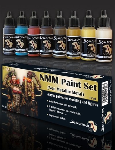 NMM staat voor Non-Metallic-Metal, dit is een techniek waarbij metaal geschilderd wordt zonder gebruik te maken van metallic verven, maar juist door de metaal look na te bootsen met normale dekkende acrylverven. In de verpakking is een uitgebreide handleiding bijgesloten.