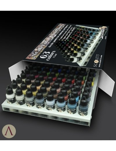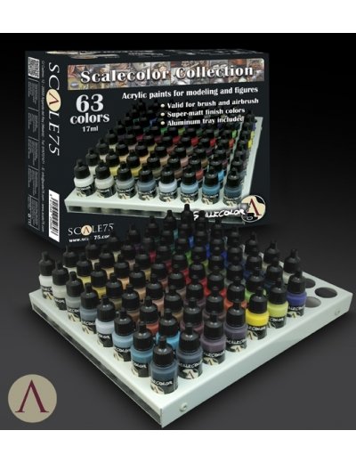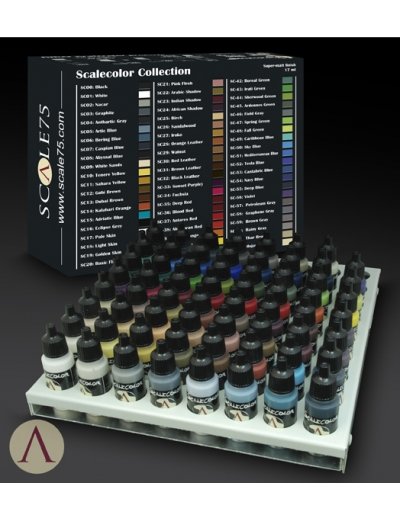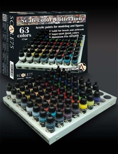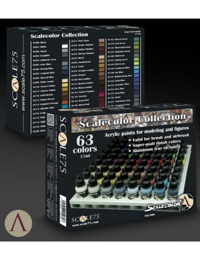 Scale 75 Scalecolor Collection bevat 63 potjes Scalecolor acrylverf van 17ml. Deze verf kan zowel met het penseel als met de airbrush verwerkt worden en heeft een goede dekkracht en vloeit prettig.