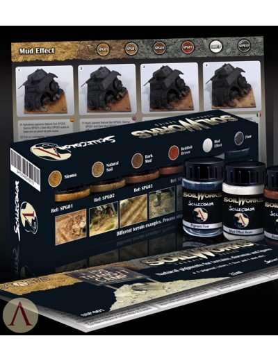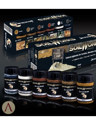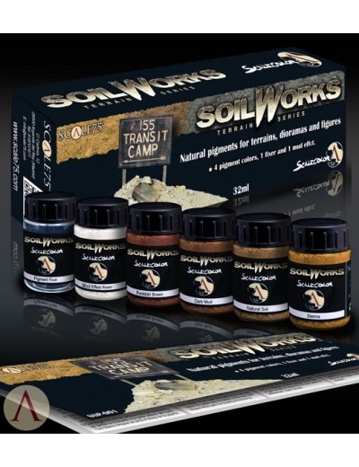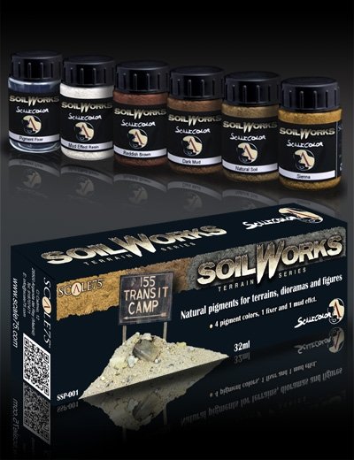 Scale 75 Soil Works Terrain Serie 1Â bevat 6 potjes Scalecolor pigmenten van 32ml. Natuurlijke pigmenten voor terrein, dioramas en miniaturen. De set bevat 4 pigmentkleuren, 1 potje fixeervloeistof en 1 potje modder effect. De verpakking bevat een handleiding hoe deze producten te verwerken.