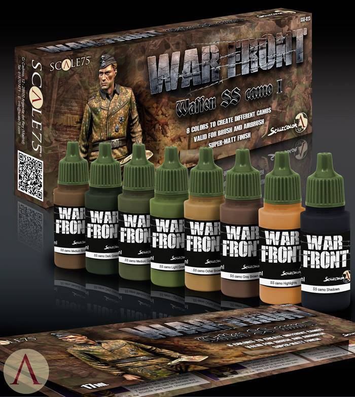 Scale 75 War Front Waffen SS Camo IÂ bevat 8 kleuren arcyl verf in 17ml potjes. Deze set bevat acht kleuren die perfect zijn om Duitse Waffen SS soldaten te voorzien van camouflage kleuren. De verf droogt super mat en kan zowel met het penseel als de airbrush gebruikt worden.