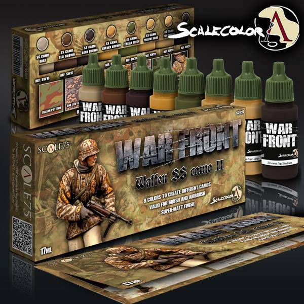 Scale 75 War Front Waffen SS Camo II bevat 8 kleuren arcyl verf in 17ml potjes. Deze set bevat acht kleuren die perfect zijn om WWIIÂ soldaten te voorzien van diverse gedocumenteerde camouflage patronen. De verf droogt super mat en kan zowel met het penseel als de airbrush gebruikt worden.