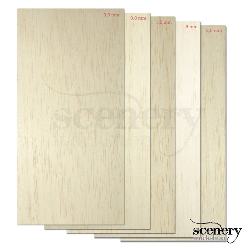 Een pakketje bevat 5 plaatjes Balsa hout van 20cm hoog, 10cm breed met 1 plaatje per dikte: 0,6mm, 0,8mm, 1,0mm, 1,5mm en 2,0mm.