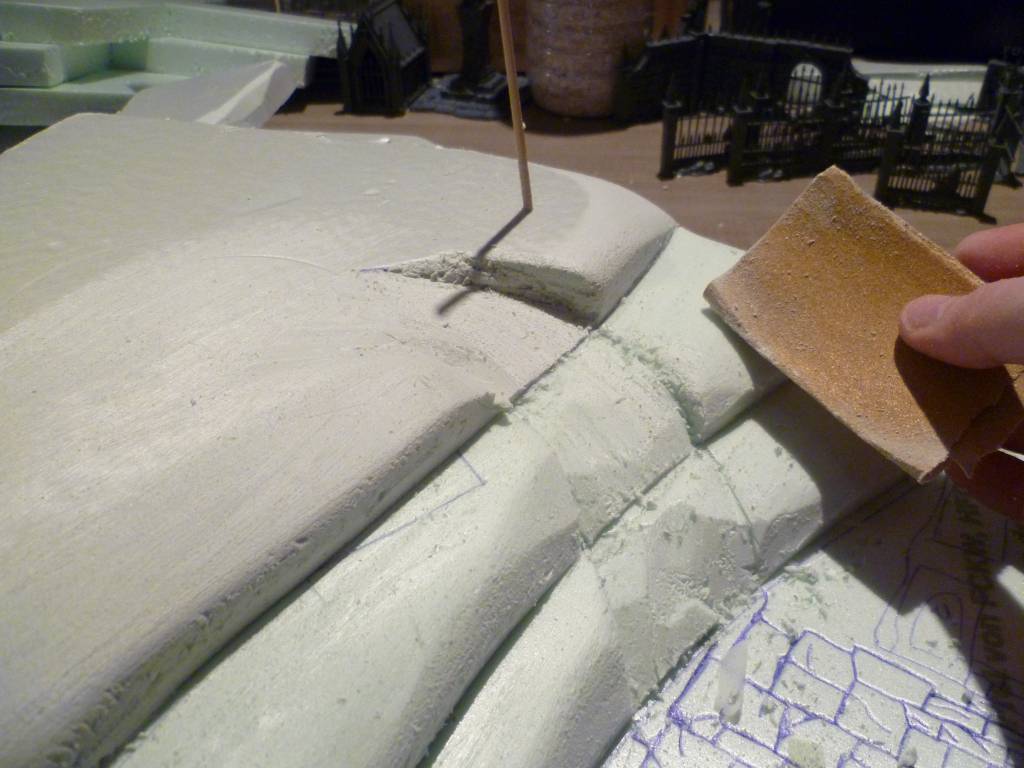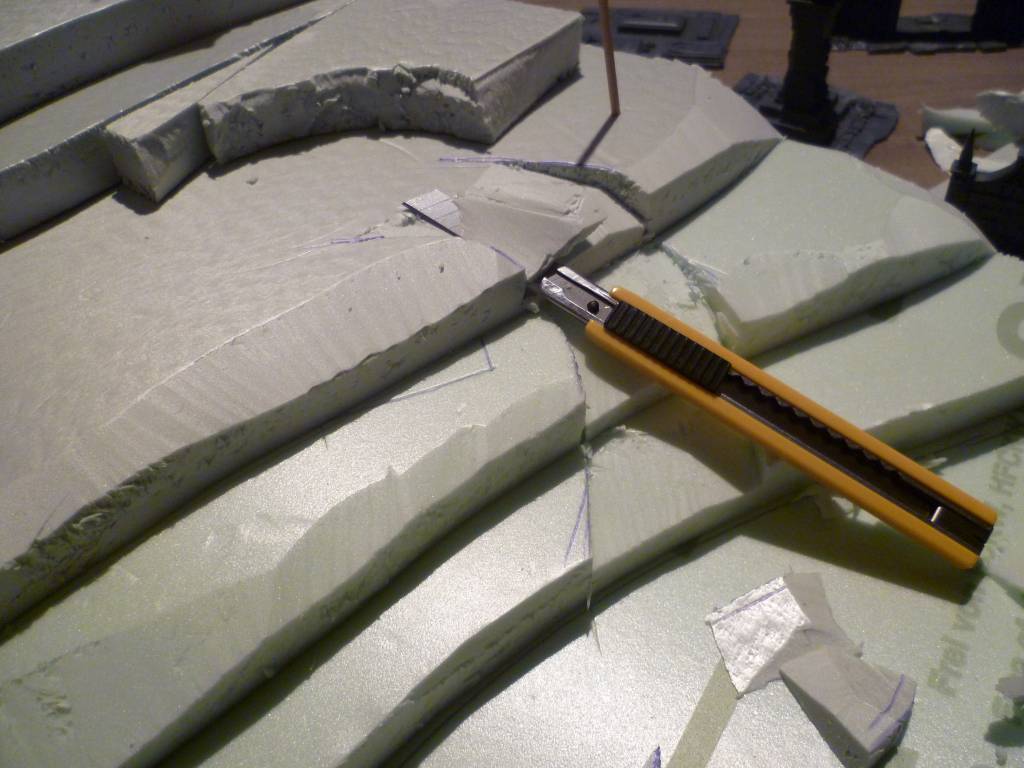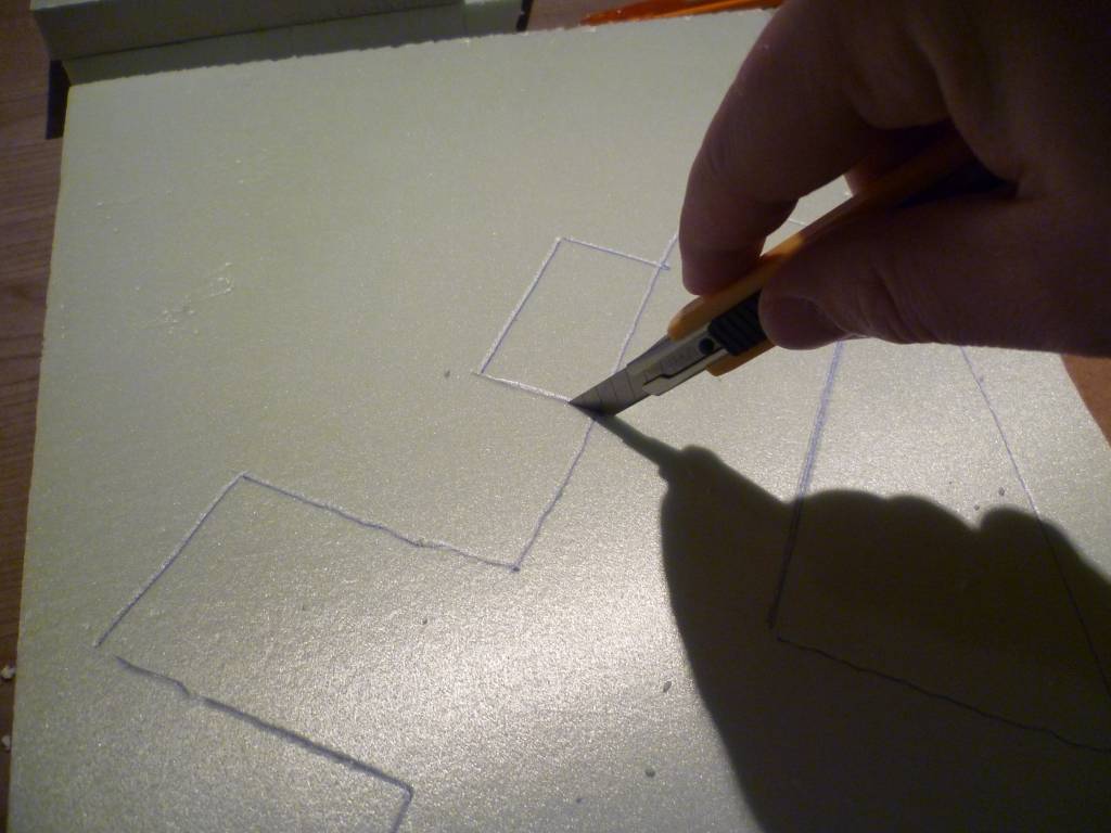 Het voordeel van Styrodur is dat het eenvoudig te bewerken is. Je kunt het snijden met een mes, maar ook bijvoorbeeld met gloeidraad, je kunt het zagen (als je grote stukken moet verwerken), maar je kunt het ook eenvoudig schuren zodat je op die manier bijvoorbeeld de scherpe kanten makkelijk weg kunt krijgen en mooie glooiende heuvels krijgt. (gebruik voor je eigen veiligheid wel een mondkapje om te voorkomen dat je het schuurstof in je mond krijgt)