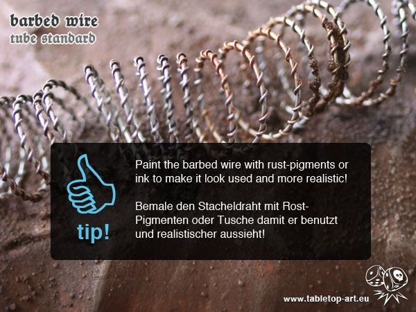 De draad is een imitatie van prikkeldraad voor schaal 28mm to 30mm, maar is niet scherp vanwege het ontbreken van de prikkers. Het prikkeldraad is ongeveer 20 cm lang in een strak opgerolde buis. De versie "standard" is uitstekend geschikt voor miniaturen en terrein met een schaal van 28mm en 30mm.
