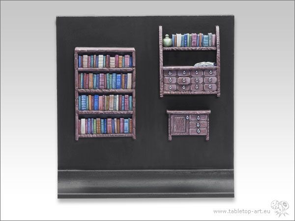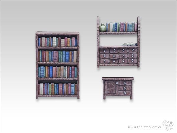 Tabletop-Art Bookshelf / Commode Set (Boekenrek set) (TTA600008) bevat 3 kasten, waarvaan 1 gevuld met boeken, 1 voorzien van boeken en laden en 1 kleine commode met laden. Gemaakt van resin en speciaal voor 28mm diorama's ontwikkeld.
