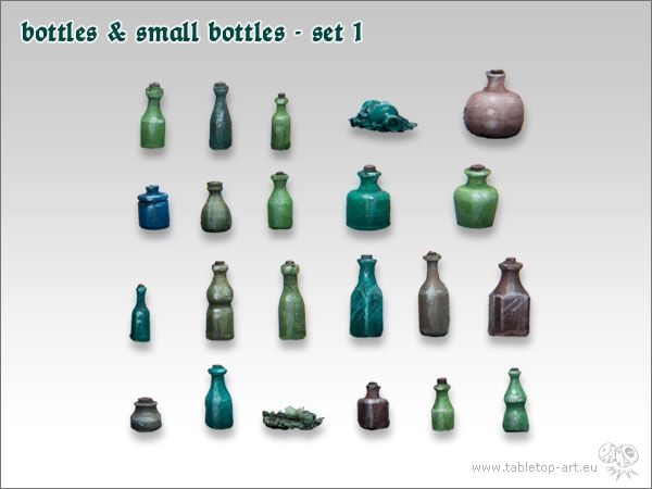 Tabletop-Art Bottles and small bottles set 1 (Flessen set 1) (TTA600003), bevat 20 grote en kleine resinflessen in verschillende vormen en 2 gebroken resinflessen. Gemaakt om de vele brouwsels van tovenaars te representeren.