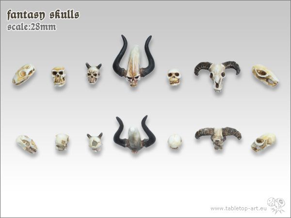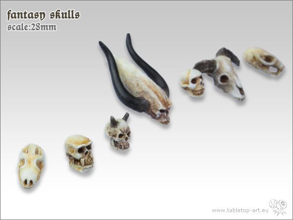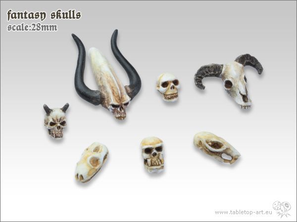Tabletop-Art Fantasy Skulls (TTA600034). De set bestaat uit 7 verschillende Fantasy Skulls. Schedels van gevaarlijke monsters: 1 x Lizard skull, 2 verschillende demon skulls, 1 x Orc skull, 1 x dwergen schedel, 1 x Beastmen skull, 1 x Ratmen skull._x000D_