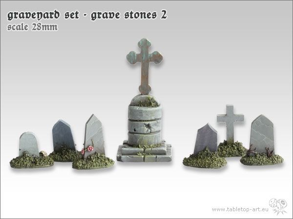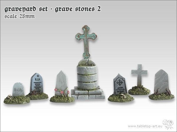 Tabletop-Art Graveyard Set - Grave Stones 2 (Grafstenen set 2) (TTA601044) bevat 7 verschillende resin ongeschilderde grafzerken met details zoals schedels, rosen en planten voor 28-30mm miniaturen.