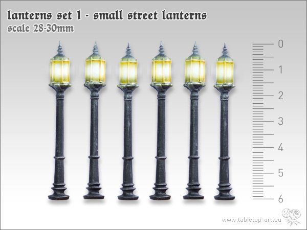 Tabletop-Kunst Lanterns set 1 - Small street lanterns (Lantaarns set 1 - Kleine straat lantaarns - TTA601055) De set bevat 6x kleine lantaarnpalen van 60mm hoog die gemaakt zijn van hoge kwaliteit resin.