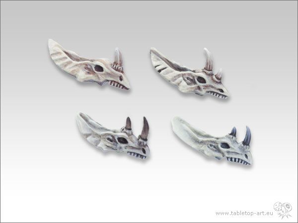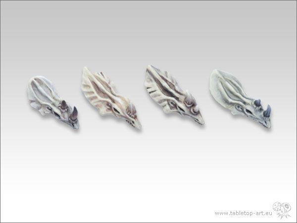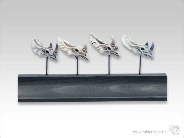 Tabletop-Art Lizard Skulls (TTA600013). De set bestaat uit 4x Skull van Lizards met een neushoorn die gebruikt kunnen worden als helmen voor miniatures, of als details in woestijn of steppe diorama's._x000D_