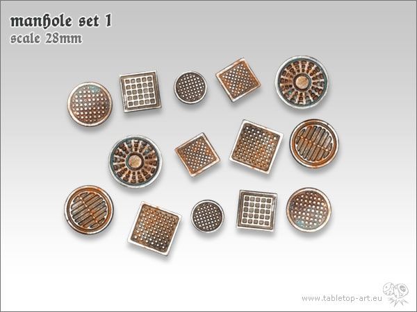 Tabletop-Art Manhole Set 1 (Putdeksels set 1) (TTA601041) bevat 14 resin ongeschilderde put of riooldeksels voor 28-30mm miniaturen. De set bevat 7 verschillende soorten kisten, waarvan er ieder 2 in de verpakking zitten.